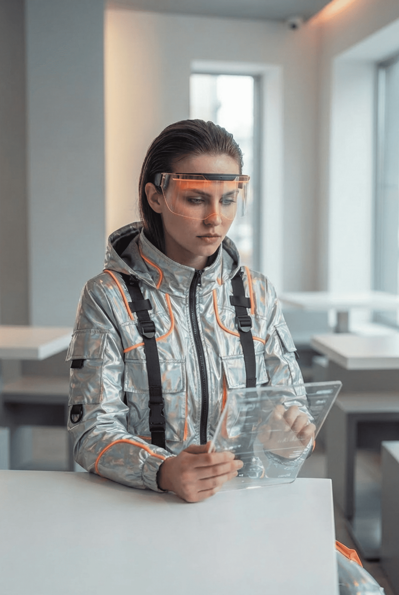 “Gere a mesma personagem sentada em um café futurista minimalista, segurando um tablet transparente. Ela está olhando fixamente para a tela do tablet. Mantenha o rosto, o corte de cabelo e a jaqueta prateada idênticos. Iluminação suave de interior, dia, profundidade de campo.“