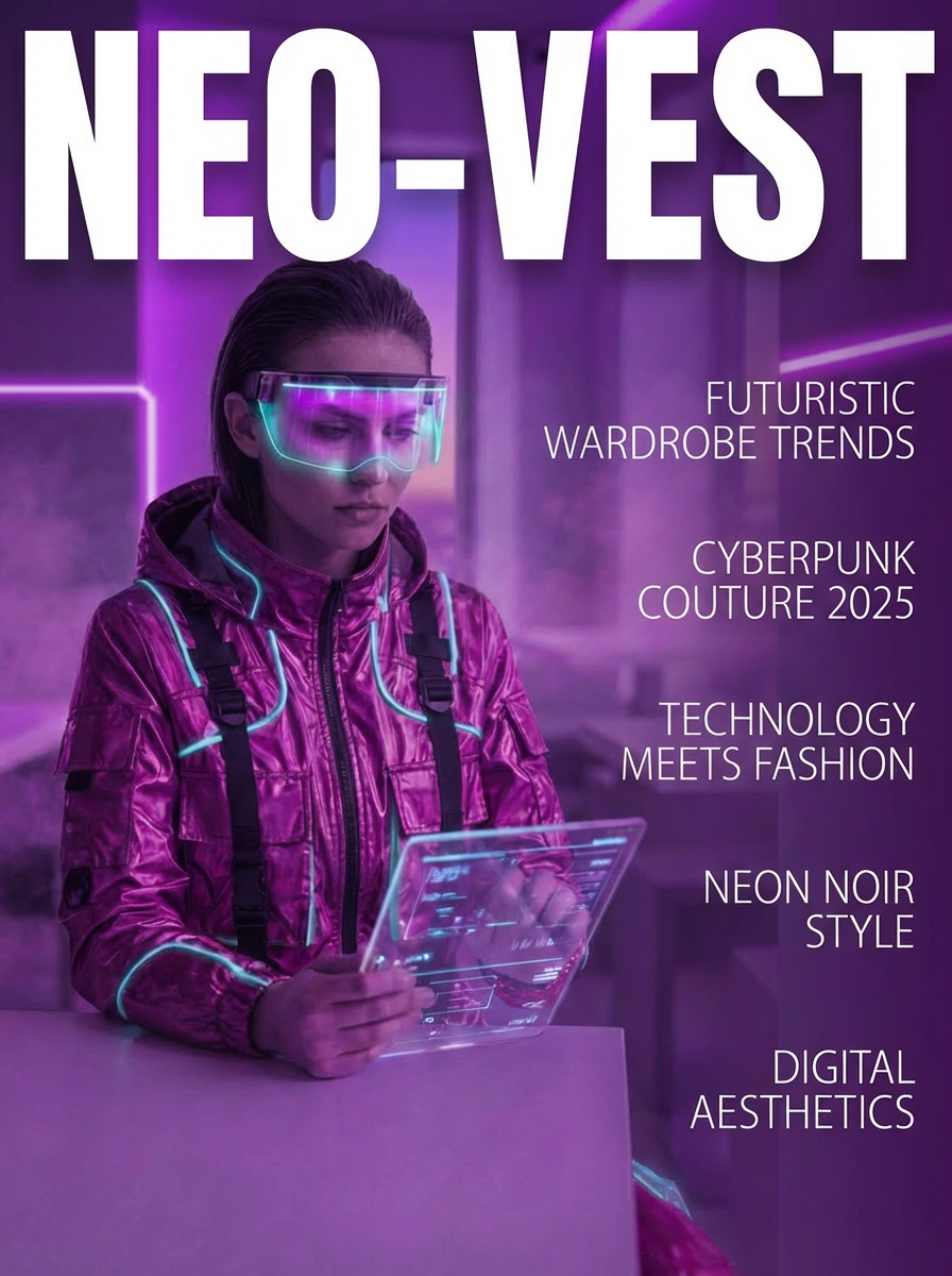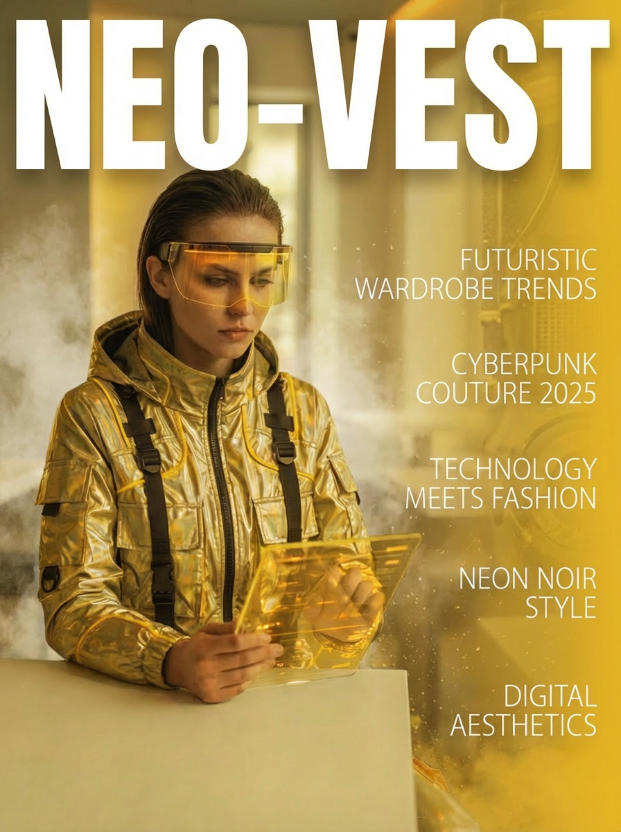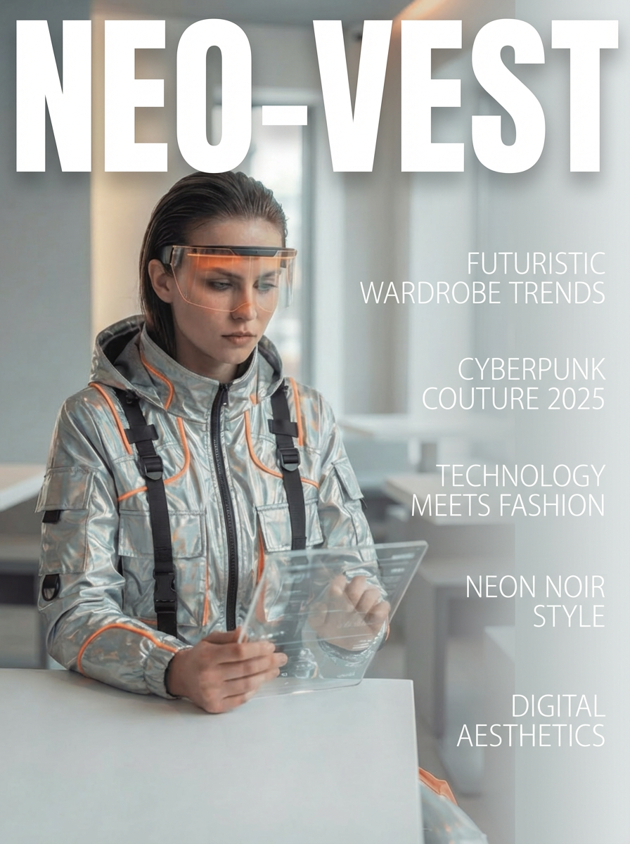 “Transforme esta imagem em uma Capa de Revista Vertical (Proporção 3:4). Reenquadre a personagem para ocupar o lado esquerdo da composição, deixando um espaço negativo limpo e amplo à direita (fundo neutro). Insira o título ‘NEO-VEST’ no topo, usando uma tipografia Sans-Serif Bold, branca e gigante. Adicione linhas finas de texto fictício na lateral direita para simular manchetes de matérias. Estilo editorial de moda high-tech, alta resolução.”