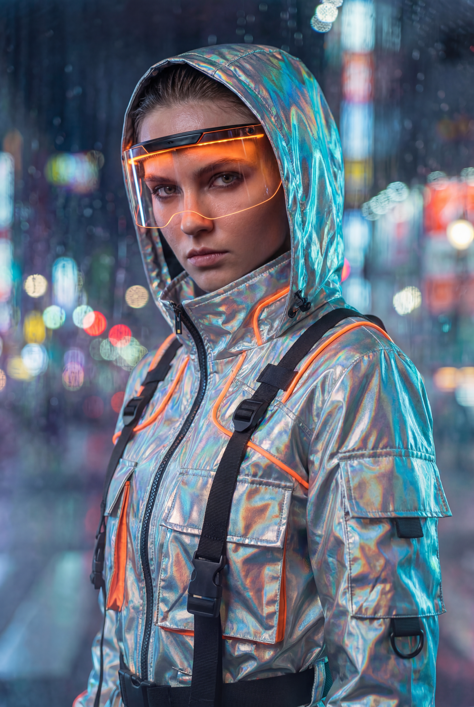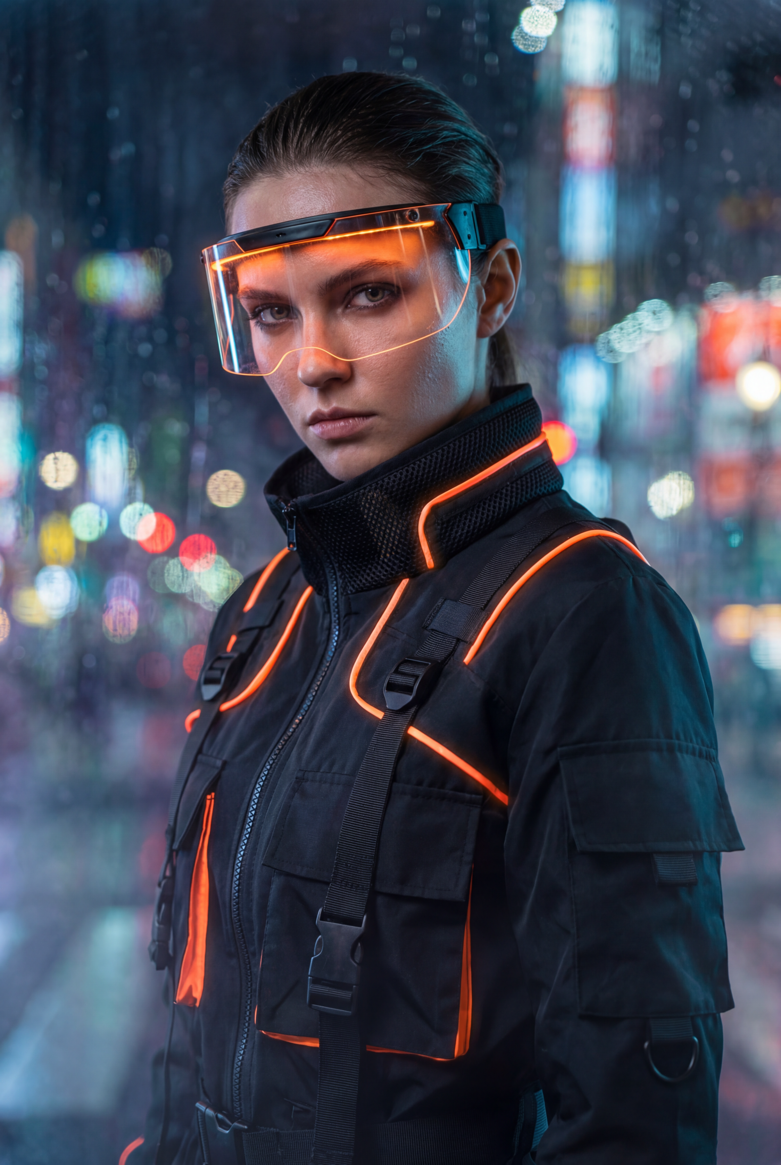 “Retrato de meio corpo de uma modelo jovem com atitude cyberpunk, vestindo uma jaqueta tática futurista preta com detalhes em laranja neon. Fundo urbano noturno desfocado com luzes de cidade (bokeh). Iluminação volumétrica, fotografia de moda high-end, pele texturizada realista, 8k, foco nítido nos olhos.”